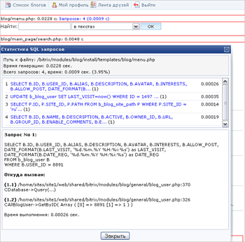 На этом рисунке представлена статистика SQL запросов для компоненты новостей на главной странице. Выводится она 2 запросами. Общее время работы компоненты составляет 0.0463 сек. Время SQL запросов 0.0274 сек. или 59.18% от времени работы компоненты (% помогает выявлять ресурсоемкий PHP код или тяжелые запросы). Возле каждого запроса указывается, сколько раз аналогичные запросы повторялись с вариацией параметров, сколько времени выполнялся запрос. В статистике перечисляется, откуда вызван запрос и с какими параметрами.